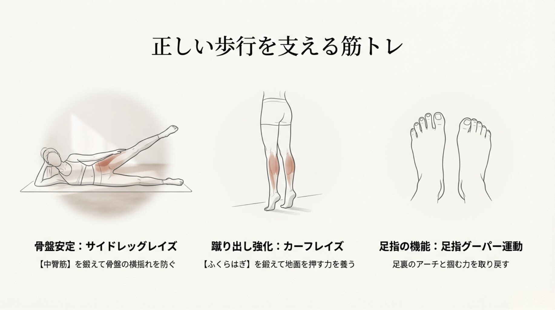 骨盤を安定させるサイドレッグレイズ、蹴り出しを強くするカーフレイズ、足指グーパー運動の図解。