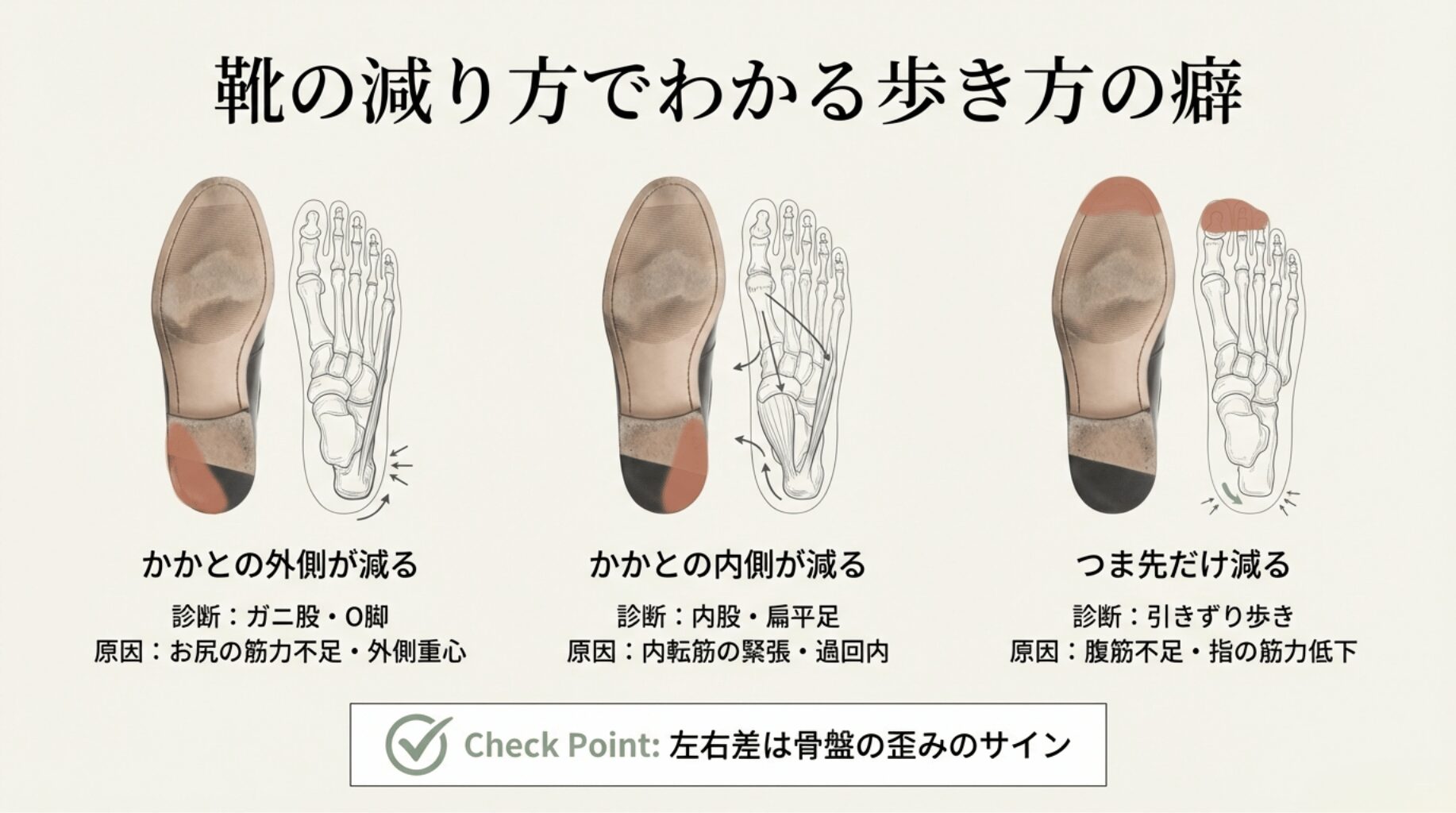左右で減り方が違う 左右非対称な歩行 慢性的な腰痛、肩こりの左右差 骨盤の歪み、脚長差