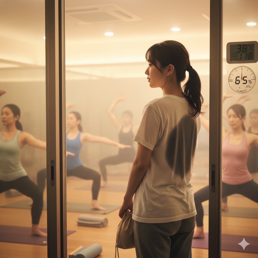 ホットヨガは、室温35〜39度前後、湿度60%前後(※スタジオにより異なります)という高温多湿のスタジオで行います。そのため、私たちが想像する以上に、本当に「滝のような汗」をかきます。常温ヨガと同じ感覚で服装を選ぶと、汗でウェアが体に張り付いてベタベタになり、不快感でレッスンに集中できなかったり、レッスン後に体が冷えてしまったりするんです。