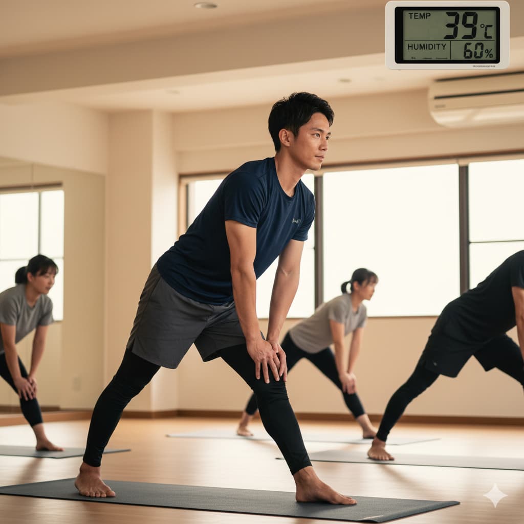 ホットヨガのスタジオは、筋肉がほぐれやすく、柔軟性が高まりやすいとされる高温多湿の環境が意図的に作られています。この特殊な環境こそが、ホットヨガの服装選びが常温ヨガや他のスポーツと根本的に異なる理由です。(ホットヨガで期待できる効果については、ホットヨガの様々な効果に関する記事でも触れていますので、よければ参考にしてください。)