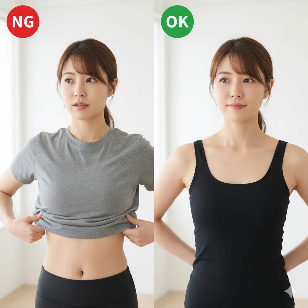 - 緩すぎる服: 大きすぎるTシャツや胸元が開きすぎたトップス。ポーズ中にはだけてしまい、そのたびに服を直す動作で集中力が途切れます。