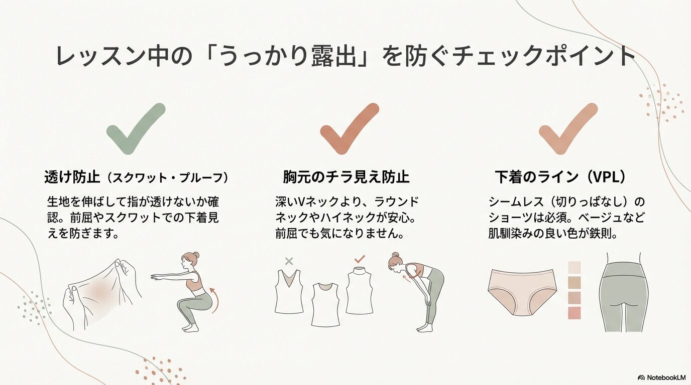 ※数値データや素材の機能性はあくまで一般的な目安であり、着用感には個人差があります。正確な商品仕様やサイズ選びについては、各ブランドの公式サイトにて最新の情報をご確認ください。また、スタジオによってドレスコードが異なる場合もありますので、最終的な判断は各施設の専門家やインストラクターの指示に従ってくださいね。