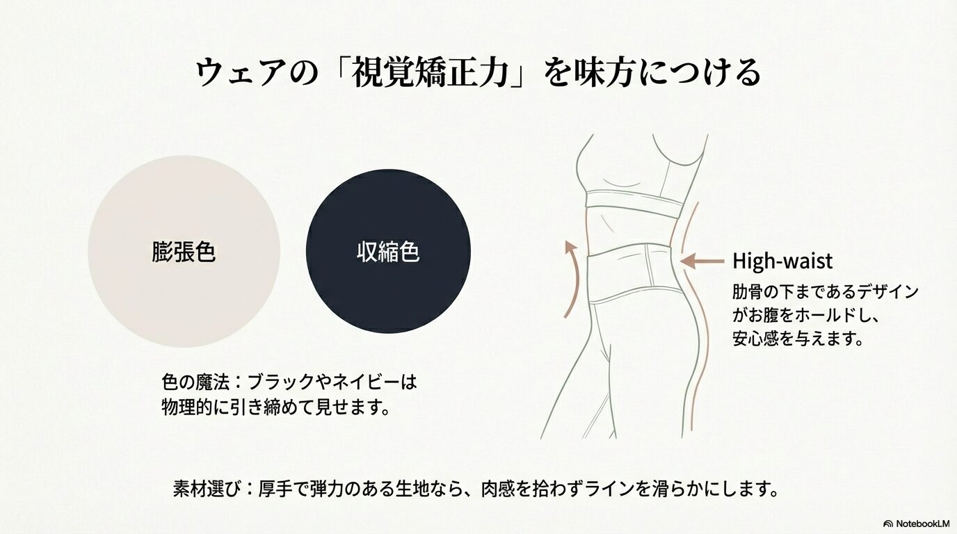 特にお腹周りの「ぽっこり」が気になる場合は、ウエスト部分が肋骨の下あたりまで来る「スーパーハイウエスト」を選んでください。幅広のウエストバンドが適度な着圧で下腹部をホールドしてくれるため、ガードルを履いているような安心感があります。また、生地が薄すぎるレギンスは、肉の段差(いわゆるハミ肉)を拾いやすいので、少し厚手で弾力のある「ハイサポートタイプ」の素材を選ぶのがポイントです。これにより、セルライトの凹凸なども目立たなくなり、鏡に映る自分のシルエットが今までよりもずっと滑らかに見えることに気づくでしょう。こうした小さな工夫の積み重ねが、あなたの自己肯定感を高め、ピラティスへの意欲を支えてくれます。