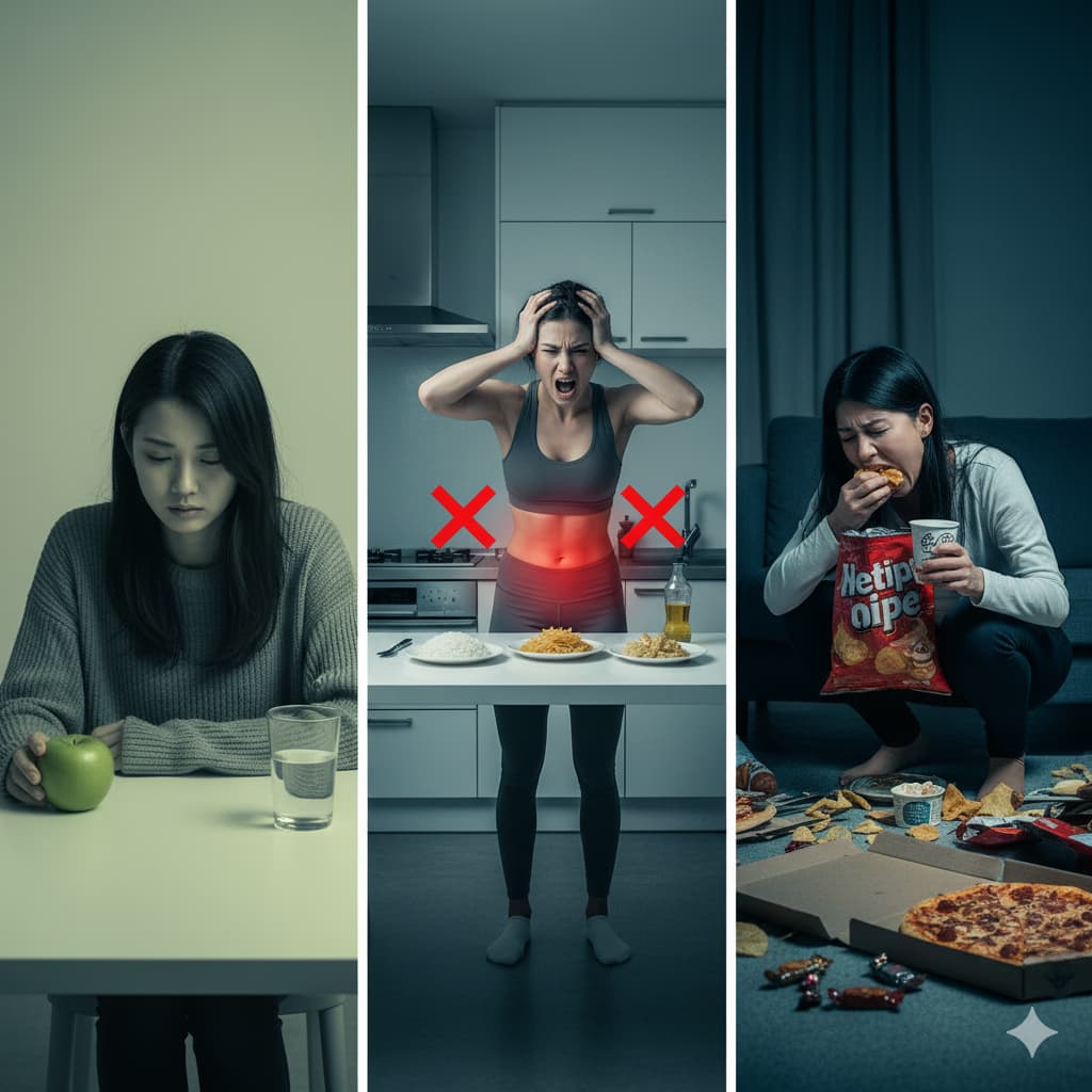 「炭水化物は敵だ」とばかりに一切摂らない、あるいは脂質を完全にカットするなど、特定の栄養素を極端に制限する方法です。糖質や脂質は、過剰に摂取すれば体脂肪の増加につながりますが、本来は脳や体を動かすための重要なエネルギー源であり、健康維持に不可欠な栄養素です。これらが極端に不足すると、体はエネルギー不足を補うために筋肉を分解し始め、代謝の低下を招きます。また、長期間の我慢は精神的なストレスを増大させ、その反動でコントロール不能な過食に走りやすく、特に糖質への渇望からドカ食いを引き起こすリスクが非常に高まります。