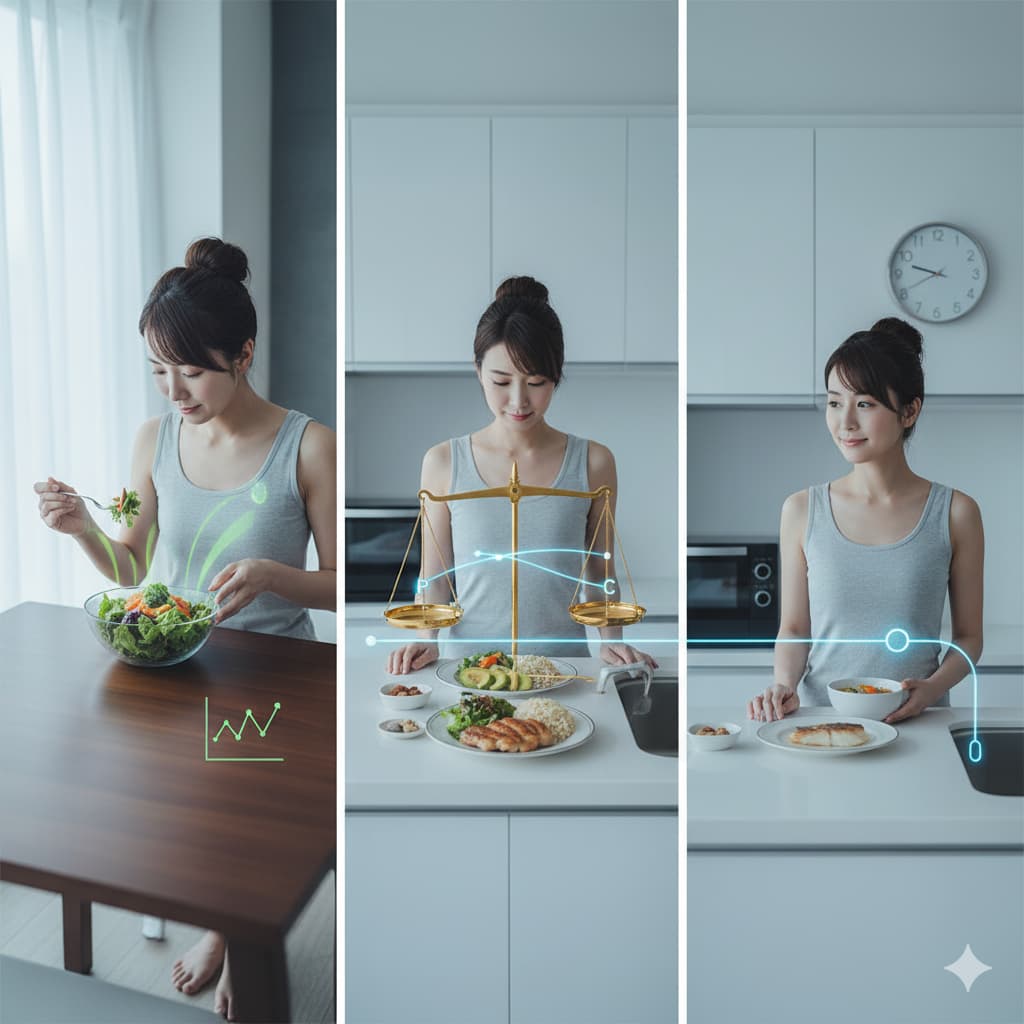 一度リバウンドを経験した後の体は、代謝が落ち、栄養を吸収しやすい「スポンジ状態」になっているため、食事のコントロールがこれまで以上に重要になります。しかし、ここで焦って再び極端な食事制限に戻ってしまうと、負のスパイラルに陥るだけです。リバウンドの連鎖を根本から断ち切るためには、科学的根拠に基づいた正しい食事アプローチが不可欠です。