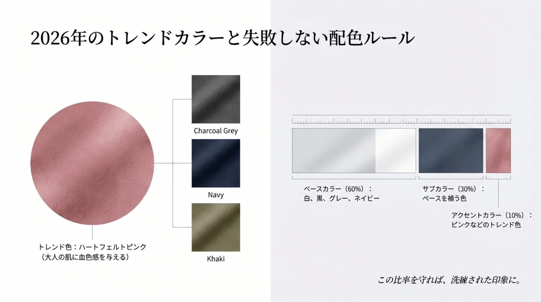 失敗しない配色:3色構成の法則 コーディネートを組むときは、以下の比率を意識してみてください。 ベースカラー(60%):白、黒、グレー、ネイビーなどの基本色。 サブカラー(30%):ベースを補う落ち着いた色。 アクセントカラー(10%):ピンクやイエローなどのトレンド色。 この比率を守ることで、色同士が喧嘩せず、誰でも簡単におしゃれなウェア着こなしが楽しめます。