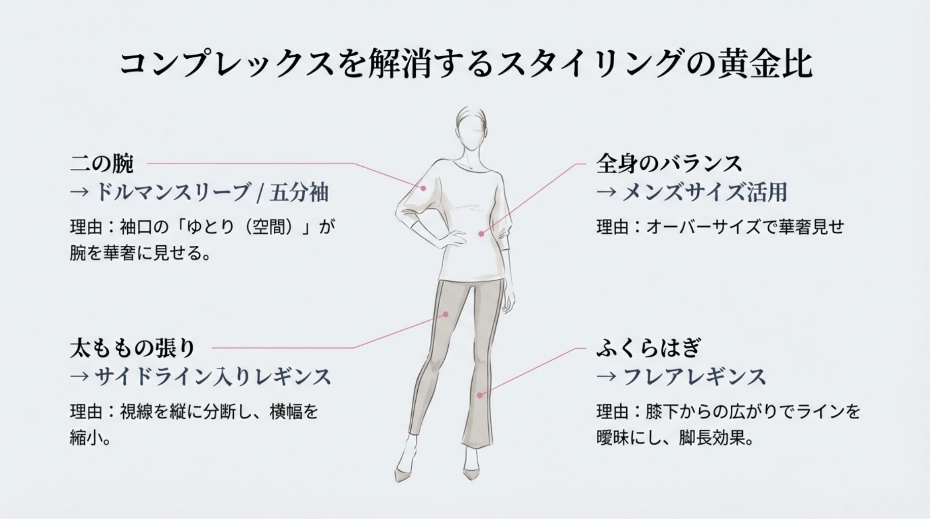 | 二の腕の太さ | ドルマンスリーブ、五分袖トップス | 袖口の「ゆとり」で腕を華奢に見せる |